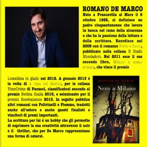 Lettore onnivoro, direttore artistico del festival Giallo di sera a Ortona, De Marco, oltre ad essere autore di romanzi di successo, da anni scrive articoli per i periodici del Giallo Mondadori. Per lui il thriller è quello anglosassone. Ha risposto per noi a qualche domanda.