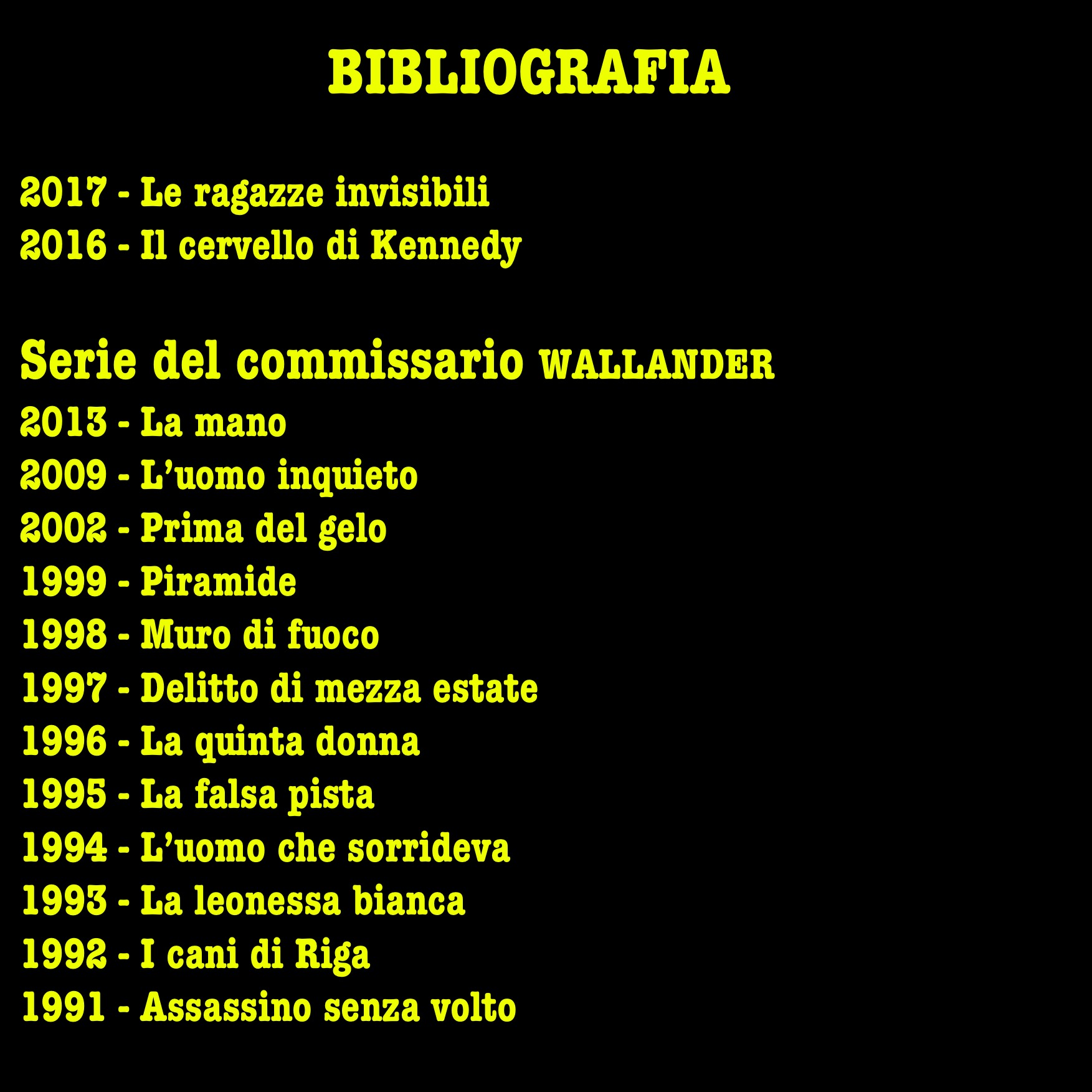 È  tra gli scrittori svedesi più tradotti al mondo: una trentina di libri per oltre 40 milioni di copie vendute in 40 lingue. Lo conosciamo soprattutto per la serie del commissario Wallander, indimenticabile figura della moderna crime fiction, un antieroe tormentato alle soglie della pensione, malato di diabete, con un carattere ruvido e disincantato ma al tempo stesso assetato di giustizia. Wallander è stato anche protagonista di tre serie tv, due svedesi e una anglo svedese, in quest’ultima è stato interpretato da Kenneth Branagh.
