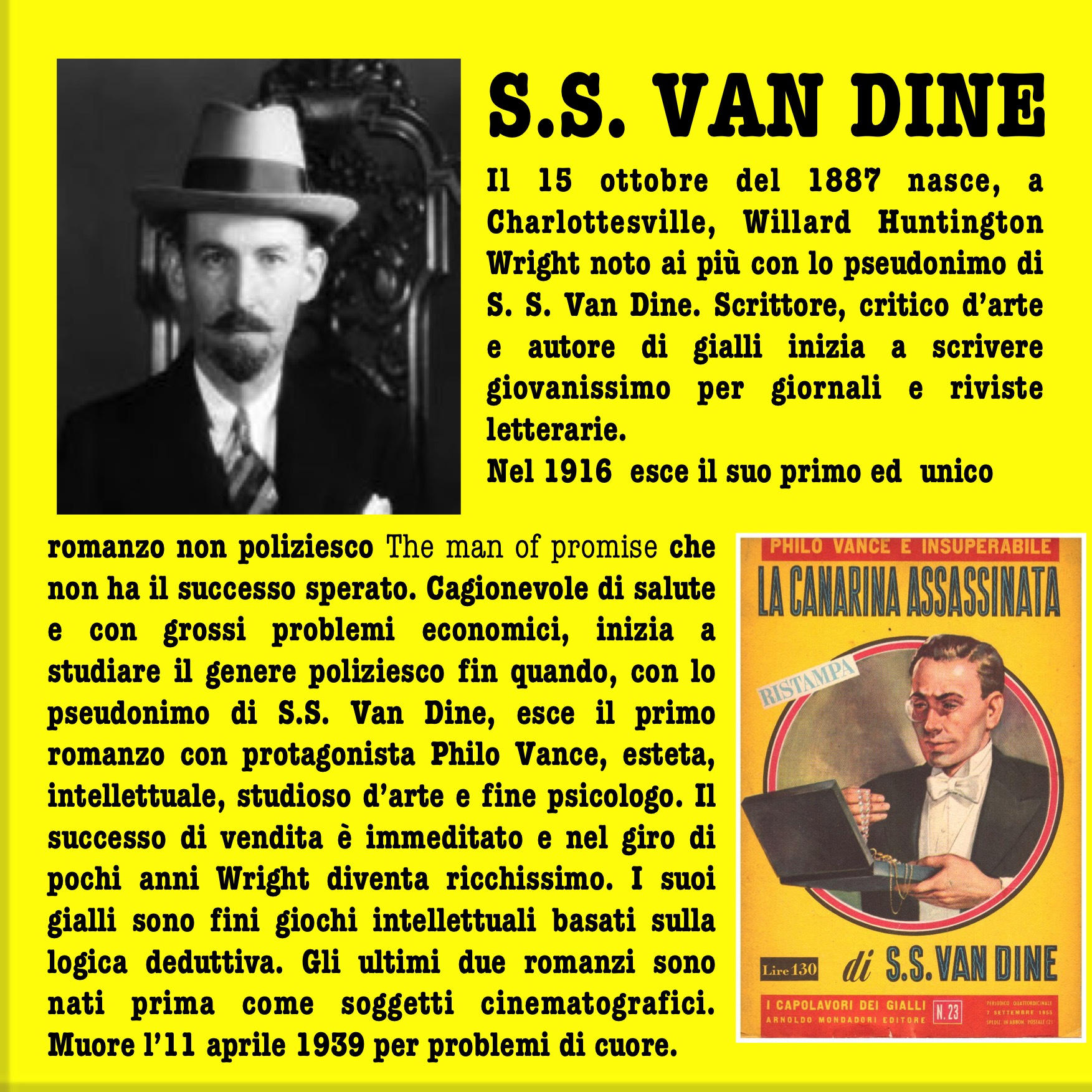 Chi lo scrive è Van Dine, pseudonimo di Willard Huntington, padre di un personaggio indimenticabile come Philo Vance, un dandy newyorkwese dotato di una brillante intelligenza. S.S. Van Dine è l’io narrante di tutti e dodici i romanzi.