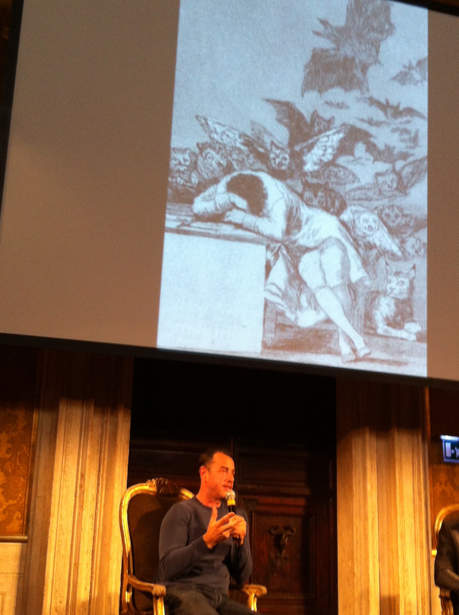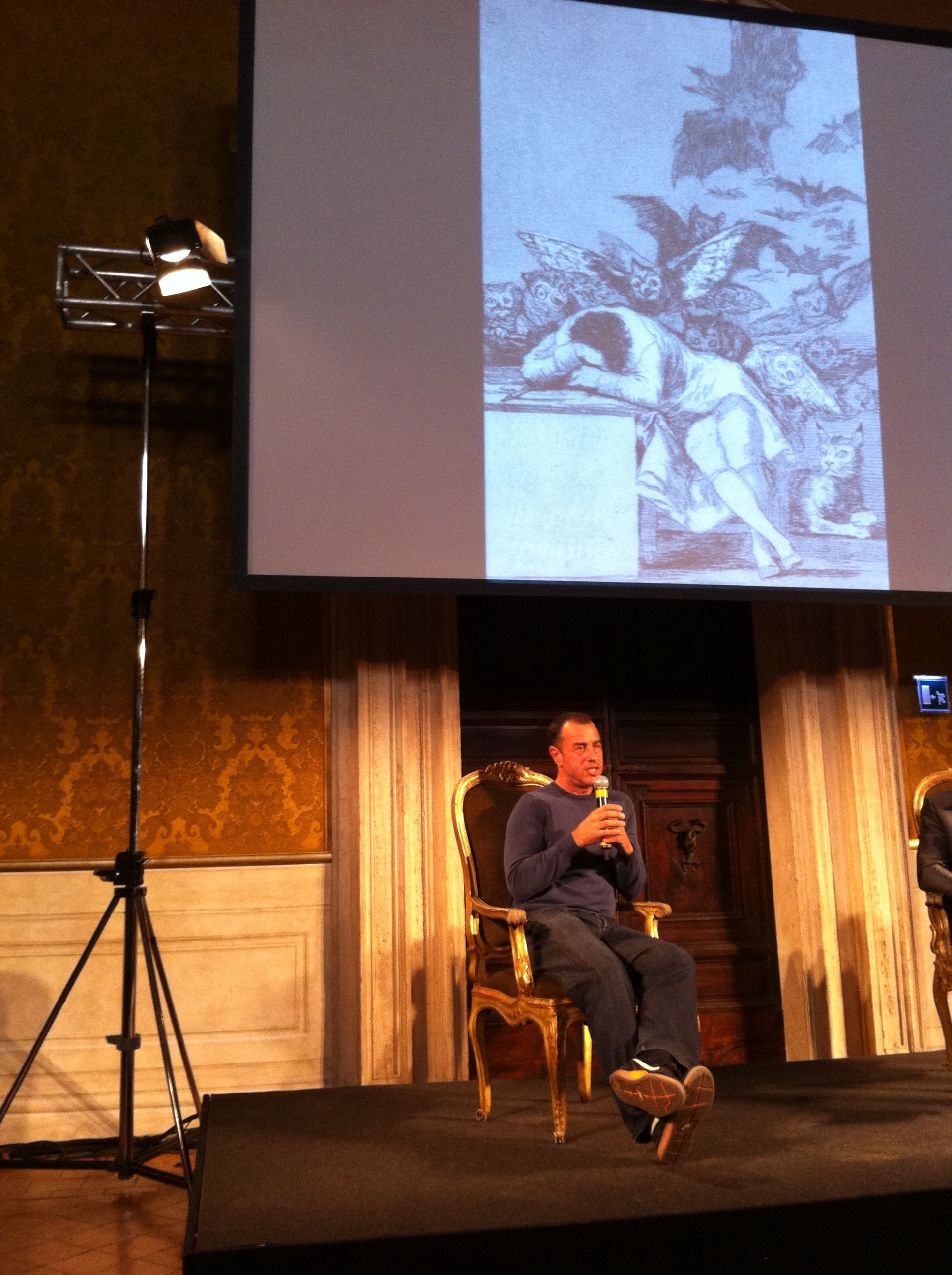«Sì, Goya è stato sempre presente nella preparazione del film» risponde alla suggestione lanciata da Massimiliano Finazzer Flory, mentre sullo schermo scorrono le immagini dei “Capricci” del grande pittore spagnolo, proiezioni fantastiche che ritraggono i vizi umani in una fantasmagoria feroce e barocca. «Ma questo non significa che si tratti di un fantasy, perché attinge a piene mani dalla realtà. Lo so che molti si chiedono come possa aver fatto un film apparentemente così lontano da Gomorra, ma in realtà è nelle mie corde e fa parte del mio percorso, anche se all’inverso: ho cercato di portare nella realtà la dimensione del fiabesco, al contrario di quello che avevo fatto nei miei film precedenti.»