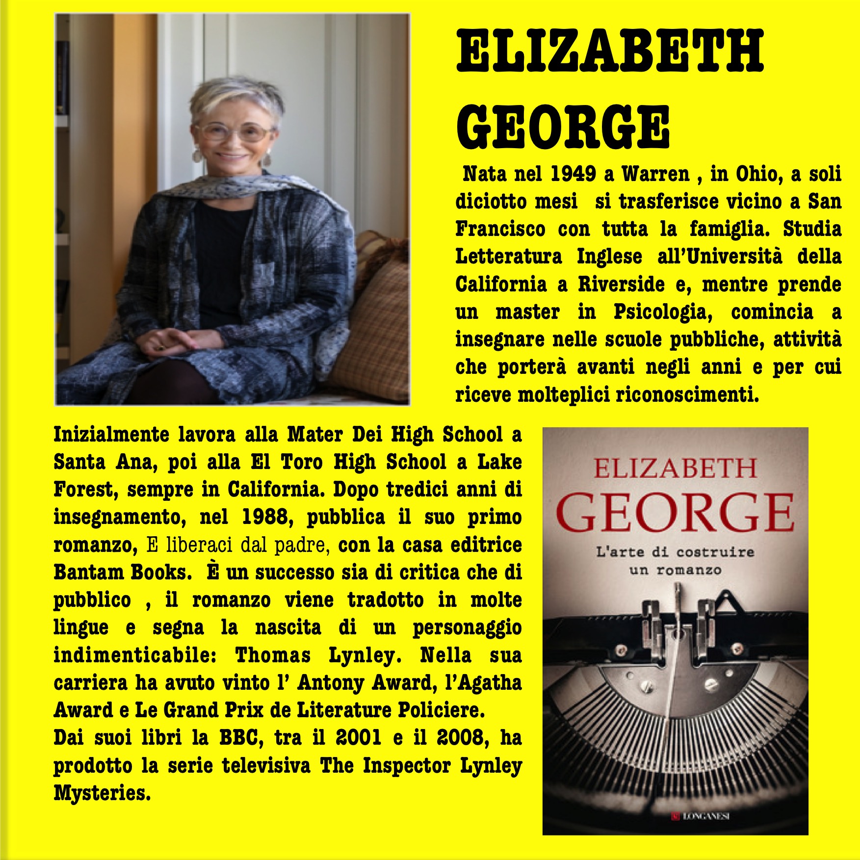 In questa raccolta di consigli di scrittura non poteva mancare una scrittrice come Elizabeth George, che non solo è una delle grandi Signore del Crime mondiale, ma è appena uscita in libreria con un volume imprescindibile per chi vuole scrivere gialli, L’arte di costruire un romanzo, edito da Longanesi.