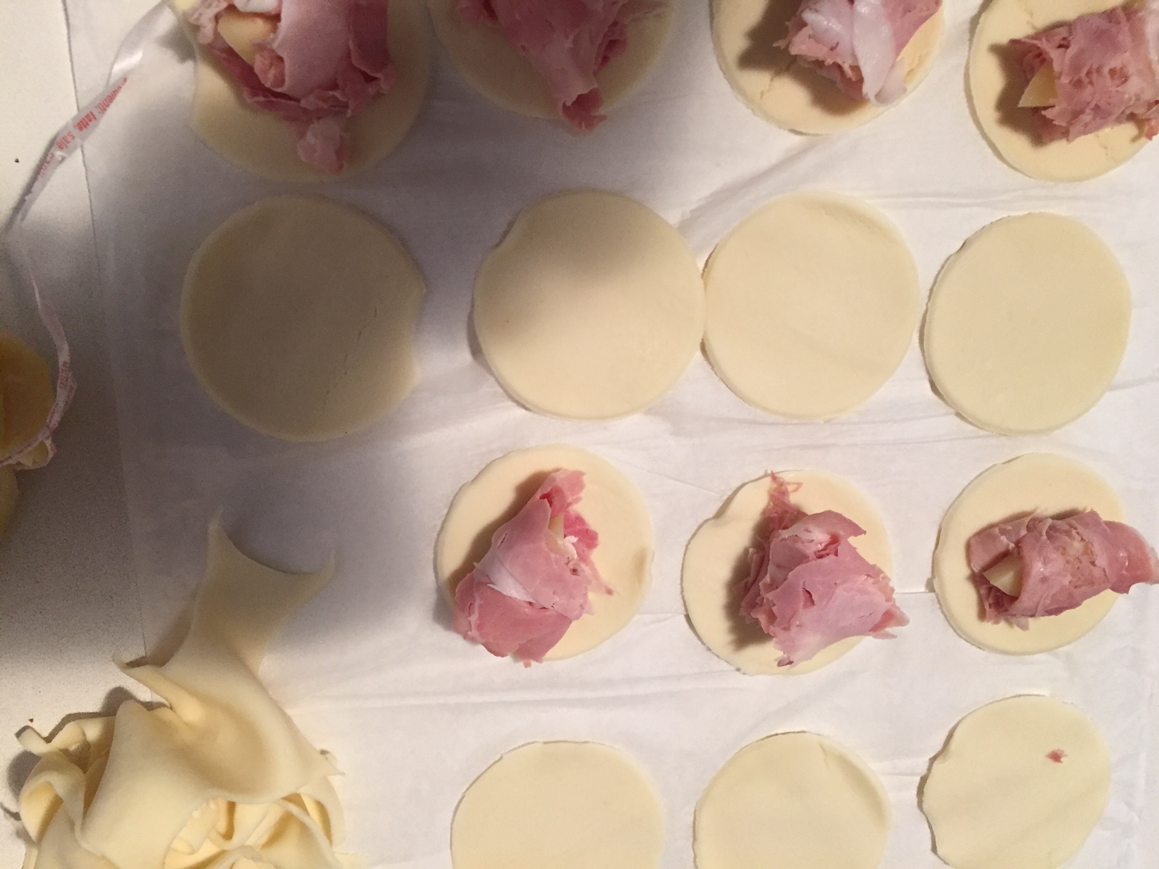 • Prendete la scamorza e tagliatela a tocchetti. Incartateli nel prosciutto cotto e poneteli al centro di un disco di pasta sfoglia.IMG_1776