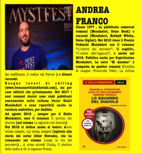 Il romanzo “Il sorriso del diavolo” nasce qualche anno fa. C’era l’occasione di una pubblicazione seriale sui serial killer, un format televisivo, approfondimenti psicologici e così via. I promotori del progetto volevano iniziare con un sk notevole e così hanno chiesto qualcosa su Jeffrey Dahmer. Poco dopo mi squilla il telefono e “te la senti di scrivere un romanzo sulla vita di Dahmer?”. Ho accettato la sfida e ho iniziato a documentarmi con film, libri, ricerche nel web, per calarmi del tutto nel personaggio. Molte delle cose narrate sono reali, non ho dovuto inventare nulla, ma provare a dargli spessore e a ragionare come lui non è stato semplice. Un viaggio… particolare. Alla fine quel progetto non andò in porto e il romanzo uscì, in versione digitale in un’altra collana. Fino a che lo speciale del Giallo Mondadori non lo ha presentato al grande pubblico, in uno speciale che condivido con due amici e validissimi scrittori: Luca Di Gialleonardo e Manuela Costantini (come me, vincitrice del Premio Tedeschi Mondadori).
